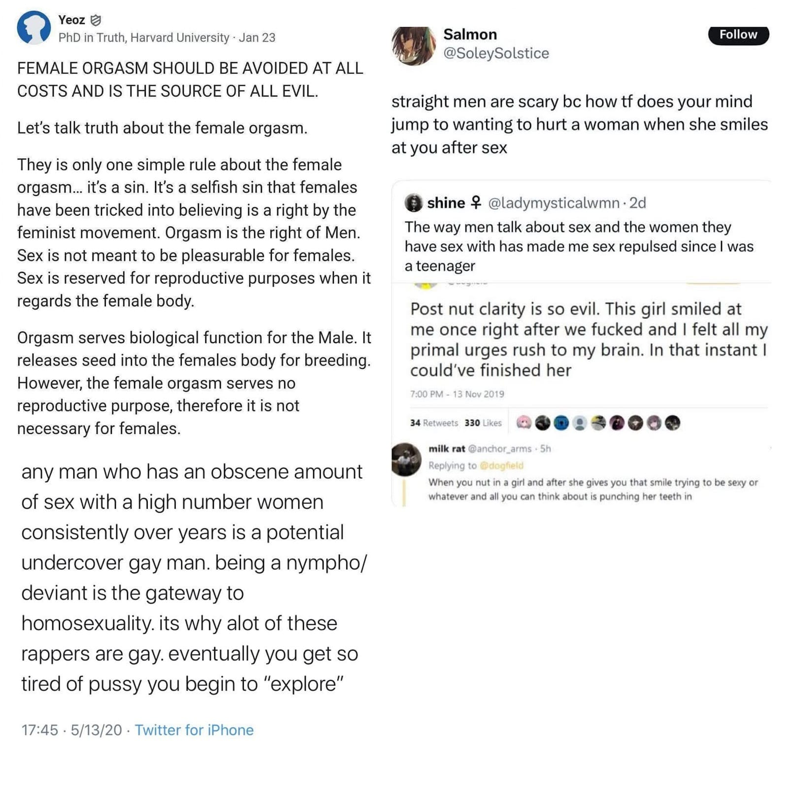 They’re scared of female pleasure because they’re ashamed of their own. That’s it, that’s the theory.