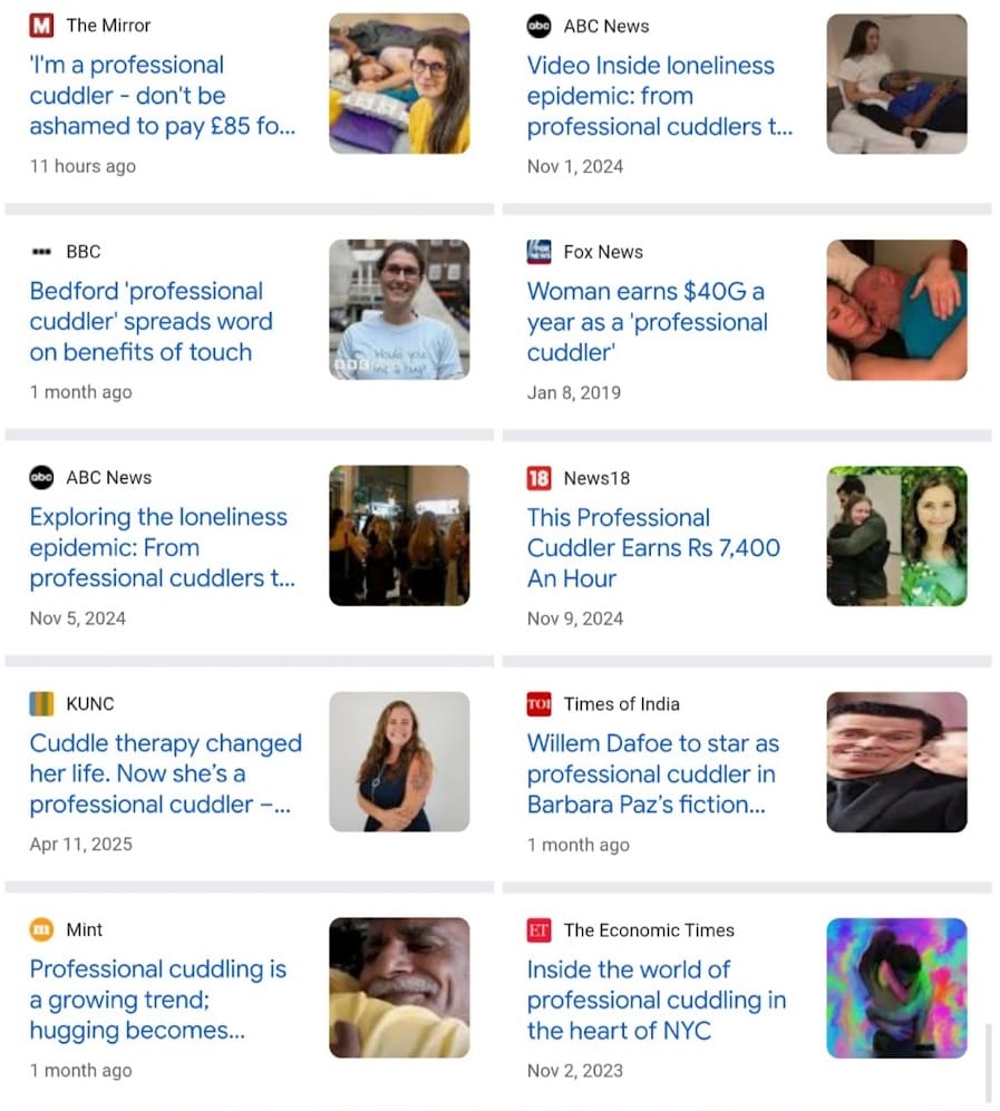 But I can’t find the damn thing, so that’s my personal experience for the day. The unavoidable intrusion of AI into the once-simple act of Googling kept saying there is “not much news” on cuddle clubs and professional cuddlers in the ‘90s, and while it does repeatedly say the concept was initially met with skepticism and suspicion, that part isn’t linked to sources.