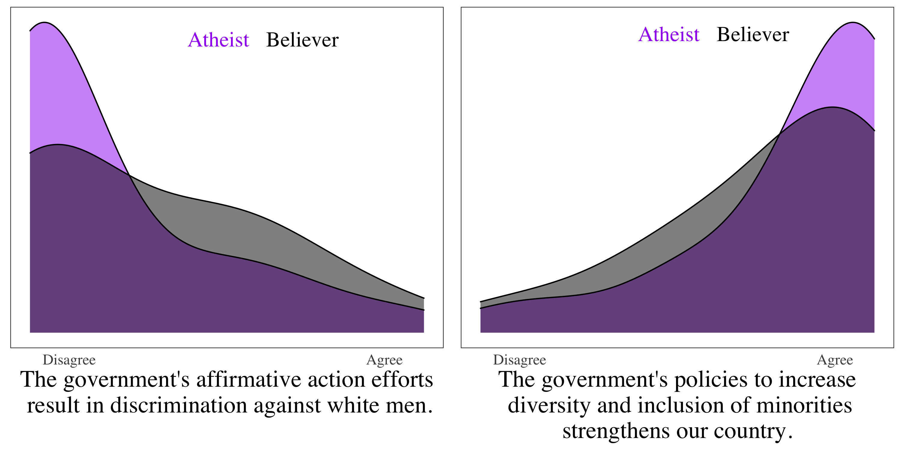 Atheists are largely united in disagreeing that affirmative action is discrimination against white men, and largely view diversity as a strength. Theists trend in the same overall direction, but are a lot more mixed in their attitudes.