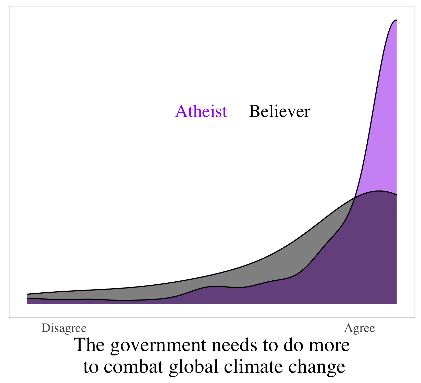 There are also some issues where both theists and atheists seem to have largely the same preferences…but again the atheists tend to be more tightly clustered. Both theists and atheists generally want the government to do more on climate change, for example, but atheists really want the government to step up.