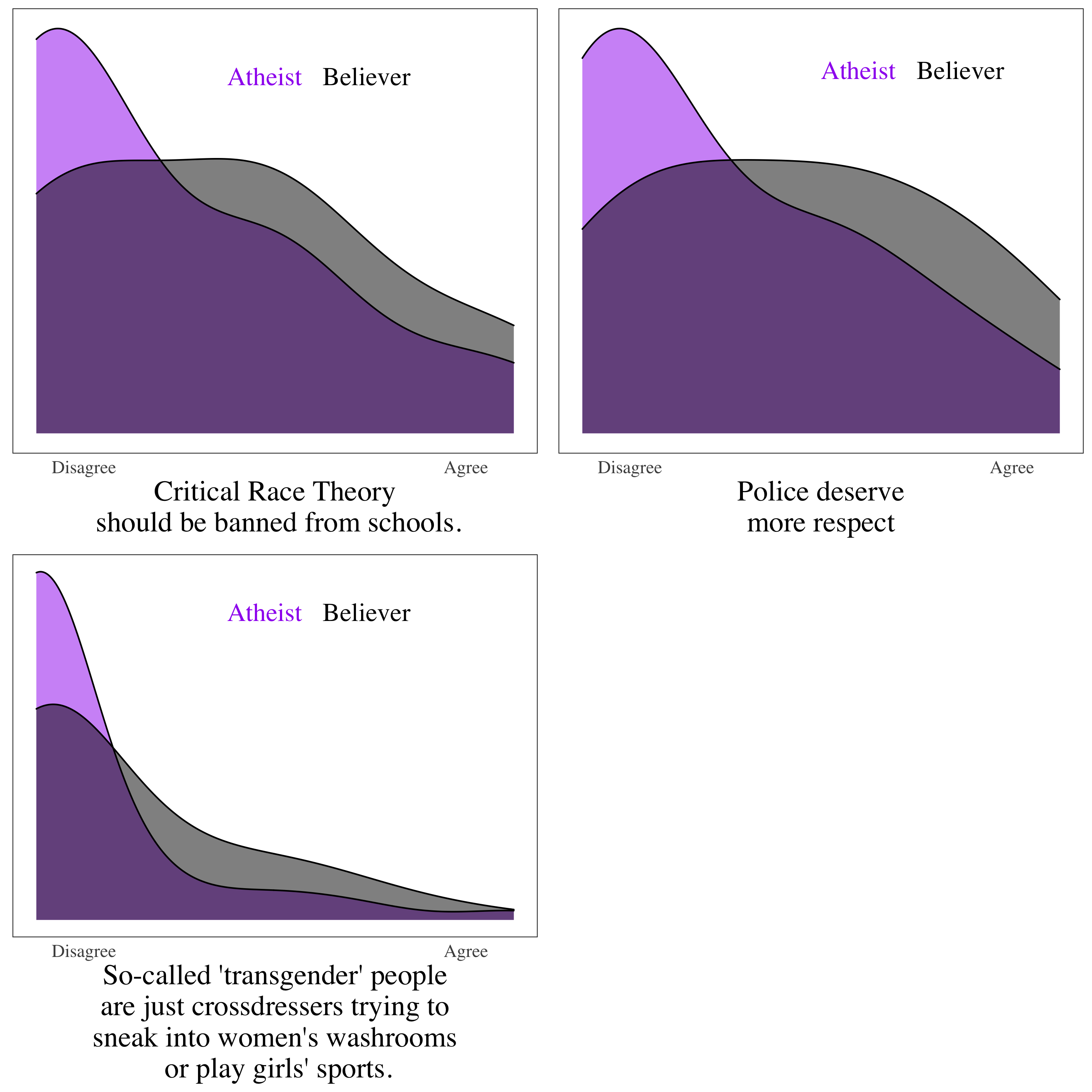 On three especially provocative current issues – the teaching of critical race theory, the legitimacy of trans identities, and respect for police—there is considerable spread among theists but again atheists trend harder left. The atheist spread on critical race theory is interesting, as some of the key players stoking a moral panic about critical race theory have their own New Atheist roots.