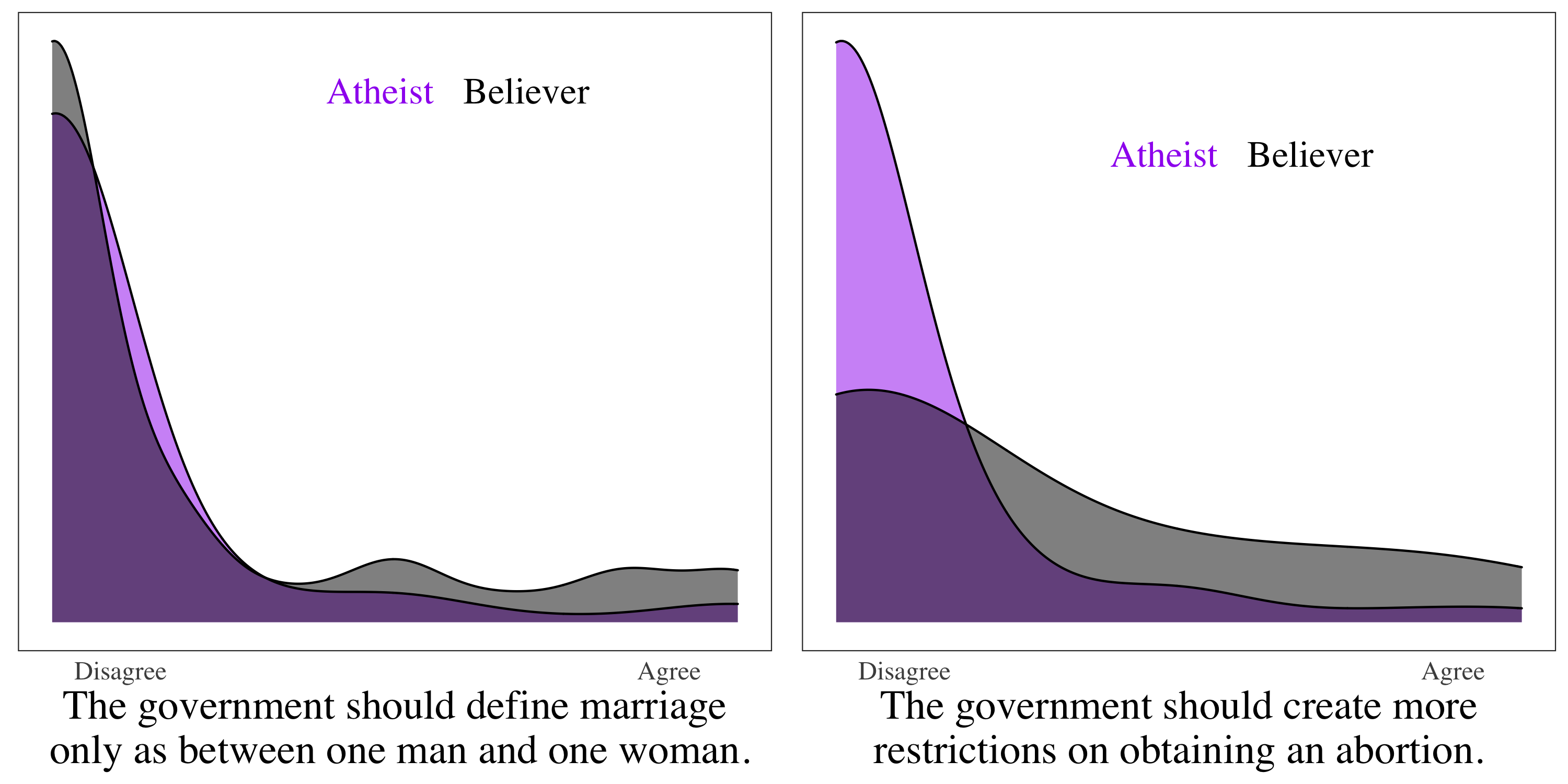 First, let’s look at some basic distributions of where theists and atheists tend to fall on various political issues. These visualizations help illustrate both the gaps between theists and atheists on issues and the variability of beliefs within each group.