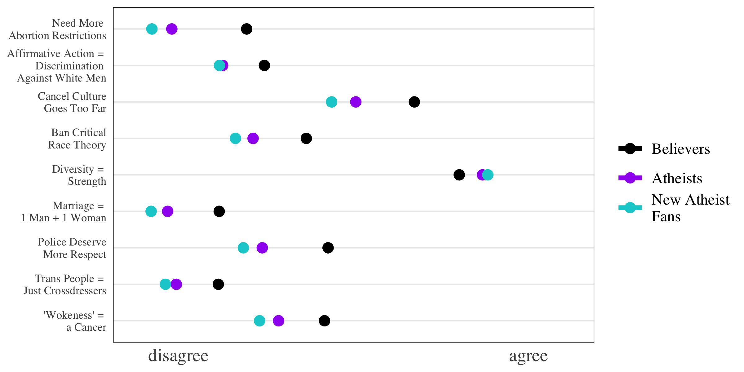 What about culture war issues? Where do theists and atheists tend to fall on the various issues that have unfortunately been lumped together under the umbrella term “wokeness”?