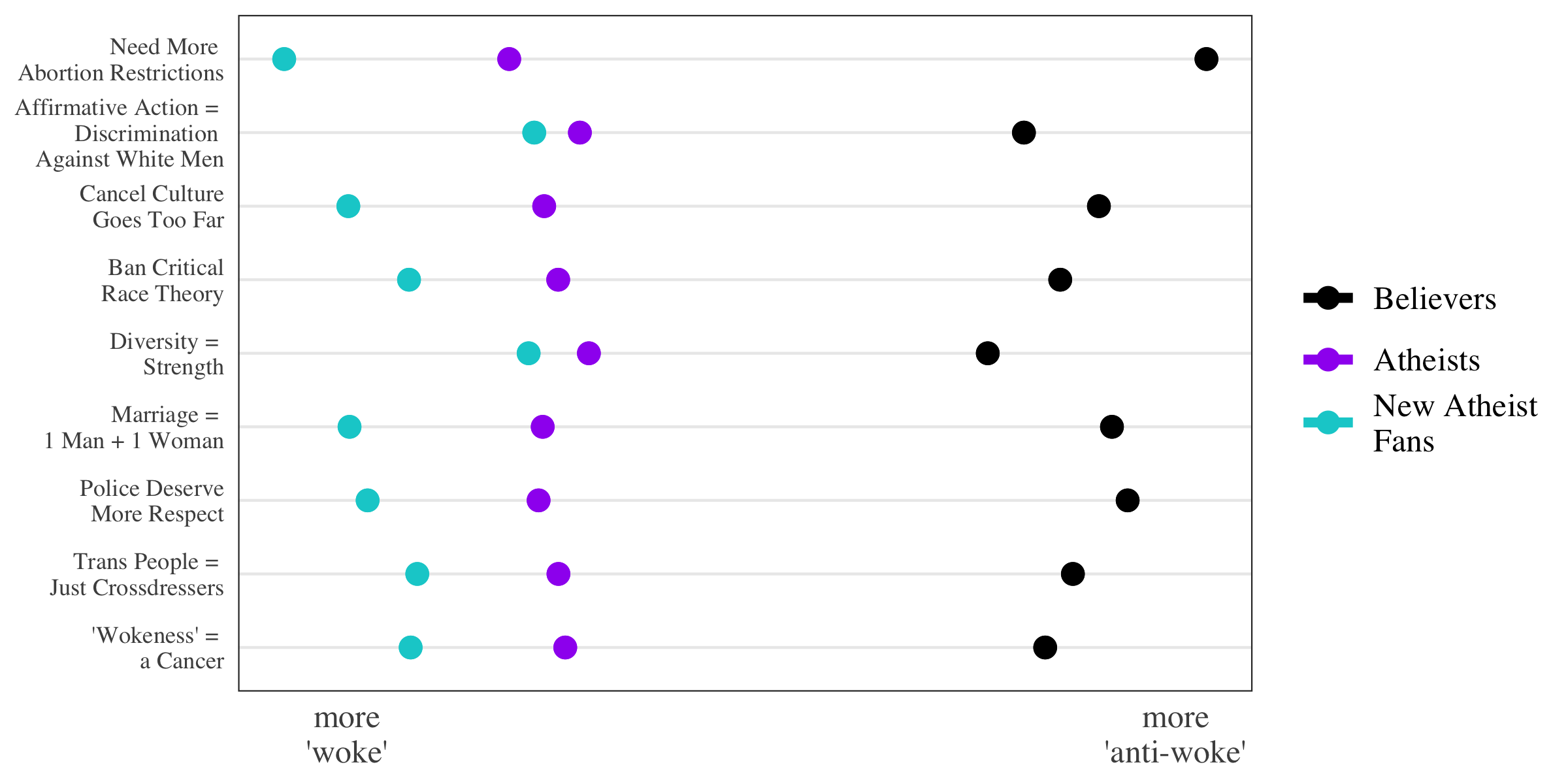 A consistent trend emerged: Theists hold positions that are more anti-woke than those held by atheists, and fans of the New Atheists run even further towards the woke end.