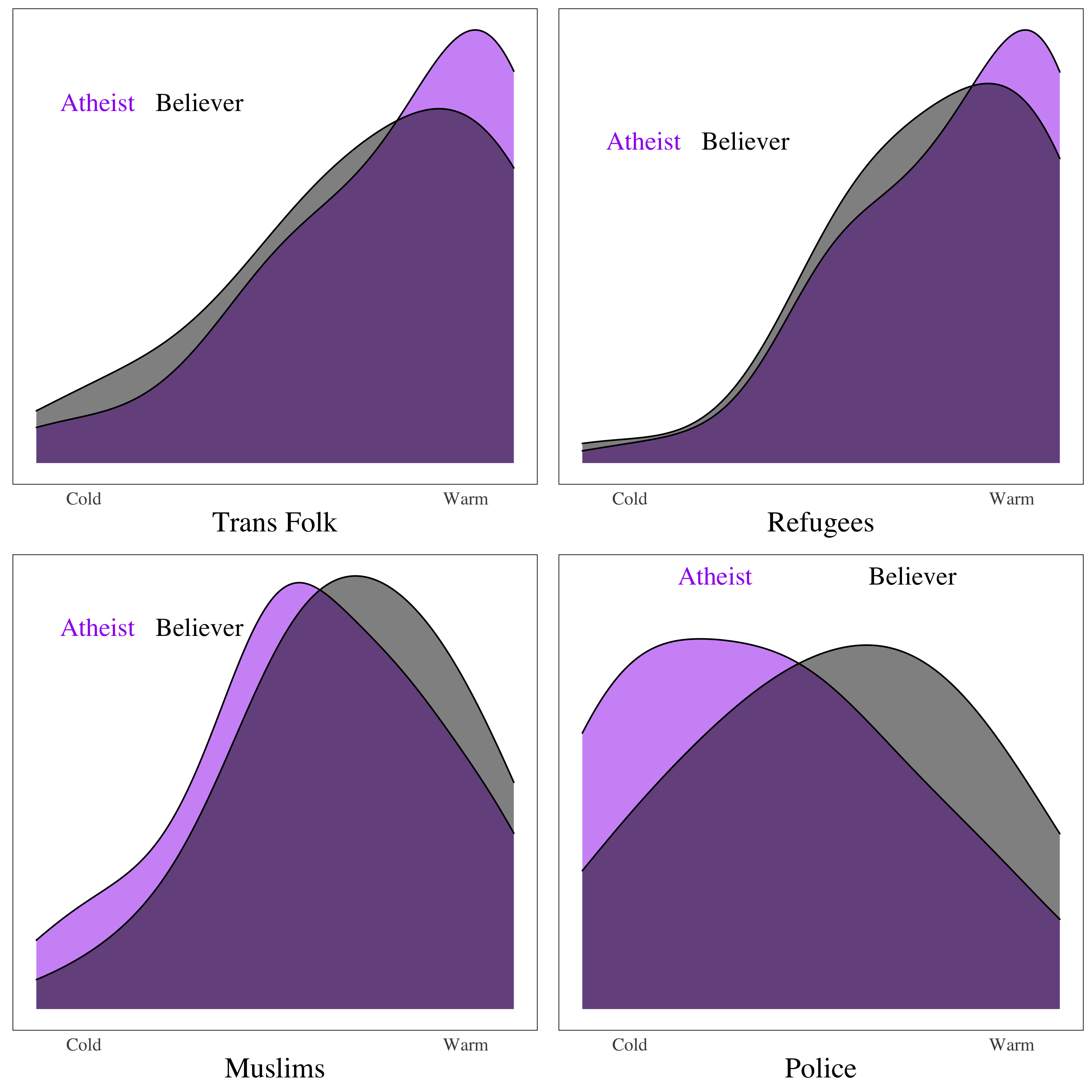 Finally, we can look at theists’ and atheists’ views towards some groups of people. Overall, atheists (relative to theists) look more favorably on trans people and refugees, but feel more coldly towards Muslims and (especially) police.