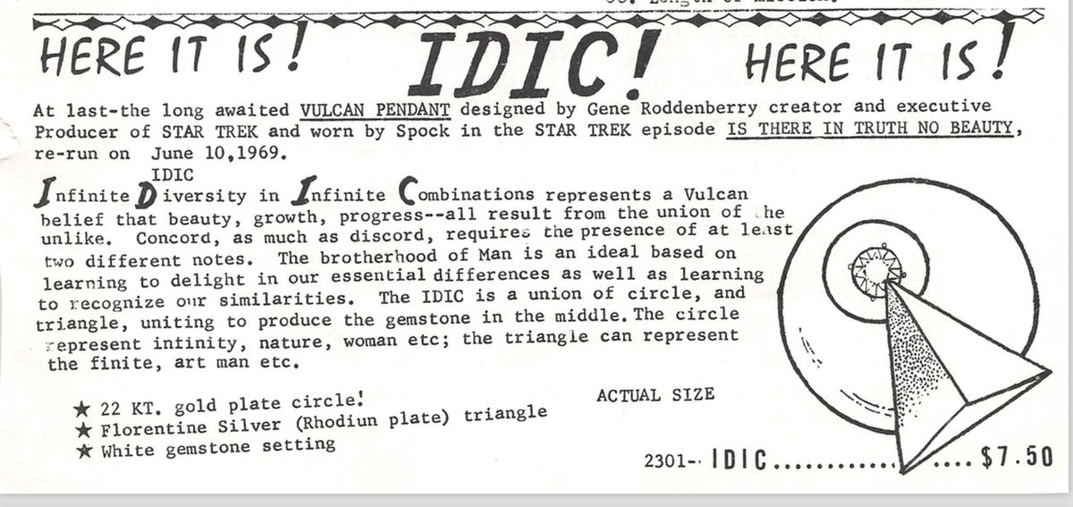 And if not? There’s at least one classic TOS concept you can lean on instead: Infinite Diversity in Infinite Combinations. This is a bit of Vulcan philosophy that, oddly enough, doesn’t show up in this episode, even though there was ample opportunity for it to serve as a bridge between franchise cultures. When “Is There In Truth No Beauty” first aired in 1969 (TOS S3E05), it came with the opportunity for fans to buy a pendant just like the one worn by Spock, to celebrate their own commitment to the idea that “beauty, growth, and progress” emerge from the union of the unlike.