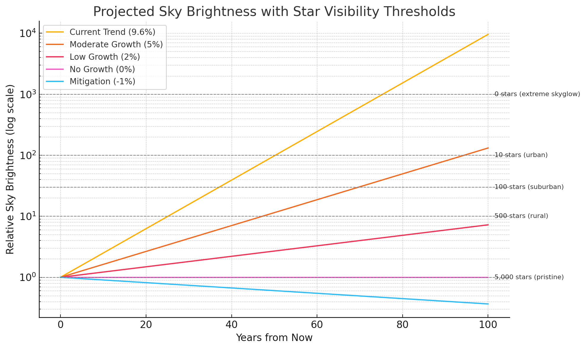 A 2023 study published in Science reports that the brightness of the night sky is increasing by about 9.6% annually. That trend may continue, level out, or decline depending on circumstances, perhaps including a collective decision that dark skies are worth protecting. If it continues, the night sky in 50 years could be over 100 times brighter on average than it is today. By 2100, most people on Earth would see no stars or planets at all. The sky would not be dark, but glowing with the diffuse light of cities, a kind of perpetual twilight.