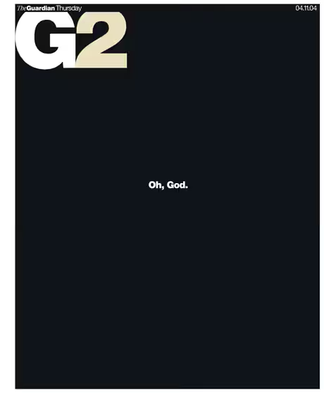 In 2004, the US made the disastrous decision to re-elect George W. Bush. The UK press and public were almost uniformly aghast. After the election was called, the Guardian's G2 magazine appeared on newsstands with a solid black front page except for tiny white lettering in the center: Oh, God.