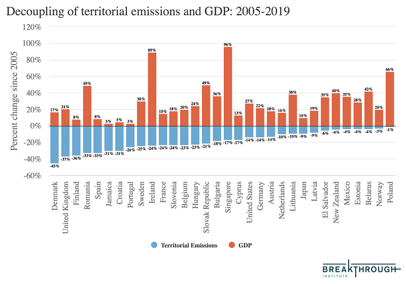 32 countries, including the U.S., have achieved economic growth together with an absolute drop in CO2 emissions since 2005. And yes, this holds when you include “consumption emissions”—meaning, when you count the carbon footprint of all goods consumed within a country, so as not to be fooled by the offshoring of industry.